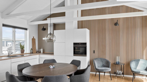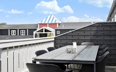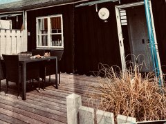 Stor åben rum med spiseplads til 6 personer, samt køkken med komfur, køleskab, opvaskemaskine m.m. samt  hyggeligstue med TV. direkte adgang til stor udeteresse lige ned til kanalen.